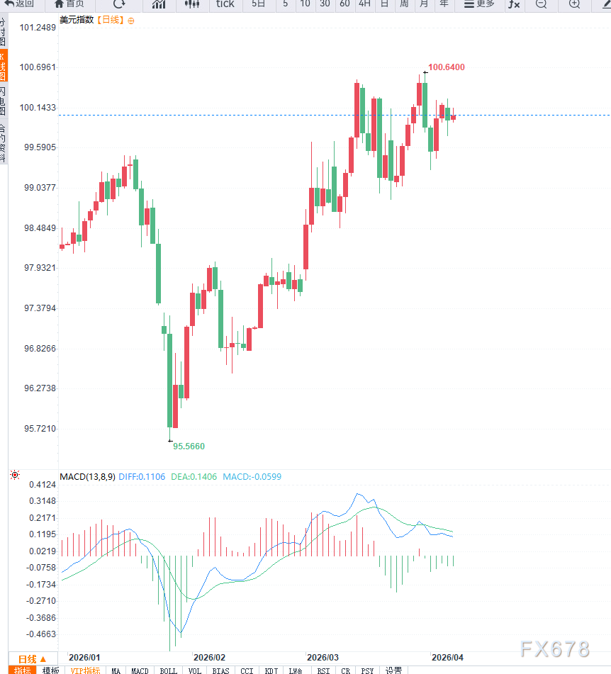 汇通财经APP讯――周二亚洲时段,美元指数升至100.10附近,延续近期反弹走势。当前美元走势主要由避险需求与利率预期共同驱动,在复杂宏观背景下维持相对强势。