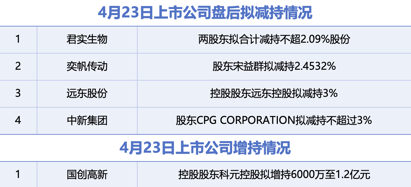 4月23日增减持汇总:君实生物等4股拟减持,国创高新增持(表) lnradio.com 2026年04月23日 21:56 4 0 炒股就看金麒麟分析师研报,权威,专业,及时,全面,助您挖掘潜力主题机会! 据统计,4月23日,盘后,君实生物、奕帆传动、远东股份、中新集团在内的4家A股上市公司披露拟减持情况。国创高新披露增持情况。