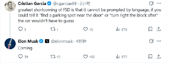 马斯克称特斯拉FSD语音控制功能即将推出 lnradio.com 2026年02月21日 15:18 5 0 一位网友评论称:“FSD最大的缺点在于它无法通过语音来触发操作。如果你能告诉它“在门口附近找个停车位”或者“过一个街区后右转”,汽车就不用猜测了。” 马斯克回应称:“即将推出。”