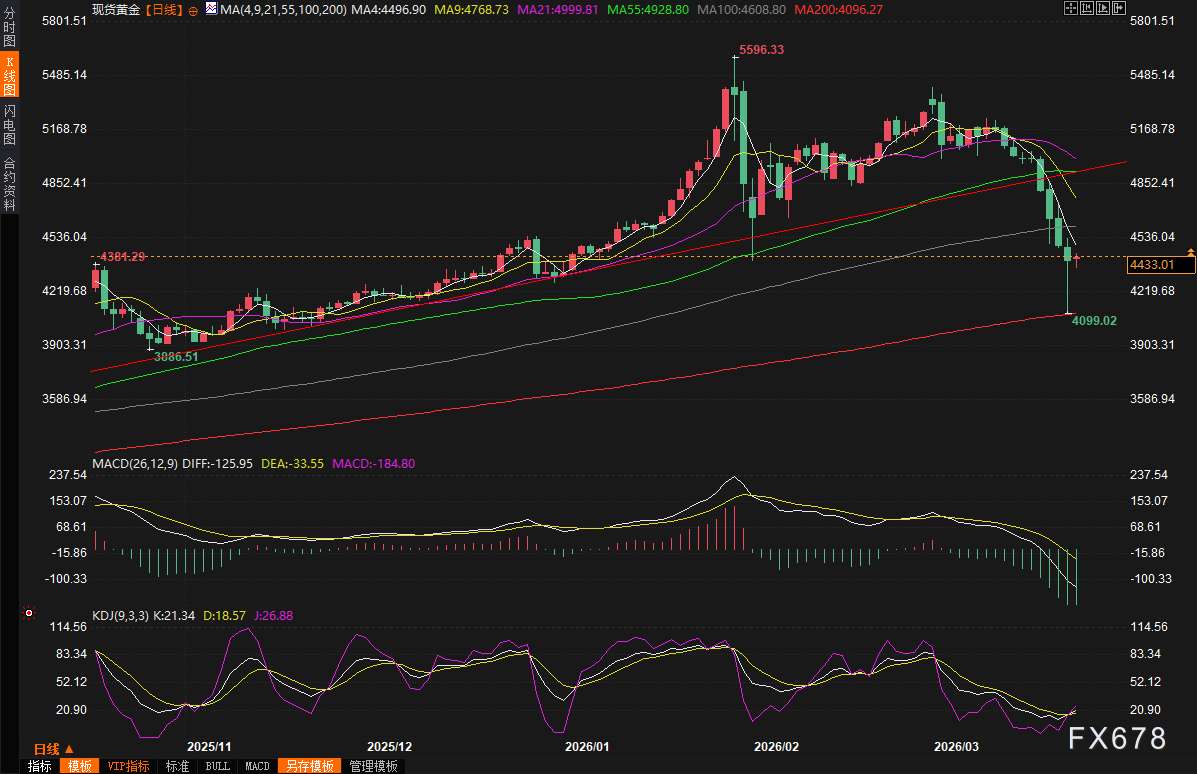 汇通财经APP讯――在中东地缘冲突持续升级的背景下,黄金作为传统避险资产,本应在战争阴云笼罩时大放异彩,然而周一(3月23日)的市场却上演了一出令人瞠目结舌的戏剧。原本因特朗普上周末发出48小时内打击伊朗能源设施的强硬最后通牒,市场恐慌情绪瞬间点燃,国际油价飙升、通胀预期急剧升温、美联储降息前景黯淡,美元指数强势拉升,现货黄金因此遭受重创,一度暴跌超过8.7%,最低触及4099美元/盎司附近,逼近200日均线支撑,也创下四个月新低,并连续第九个交易日收跌,上周更录得1983年以来最惨烈的周度表现。然而,就在投资者几乎绝望之际,特朗普突然在社交平台发文,宣布因与伊朗进行“富有成效”的对话,将对伊朗发电厂和能源基础设施的打击推迟五天,这一消息如同冷水浇灭了油市烈火,导致油价暴跌逾10%,美元指数快速回落,金价随之出现戏剧性反弹,跌幅大幅收窄,最终现货黄金收于4406.64美元/盎司左右,期金结算价报4407.30美元。周二(3月24日)亚市早盘,现货黄金震荡微涨,盘初一度下跌0.7%至4360美元/盎司,但很快回升,目前上涨0.6%,交投于4430美元/盎司附近。