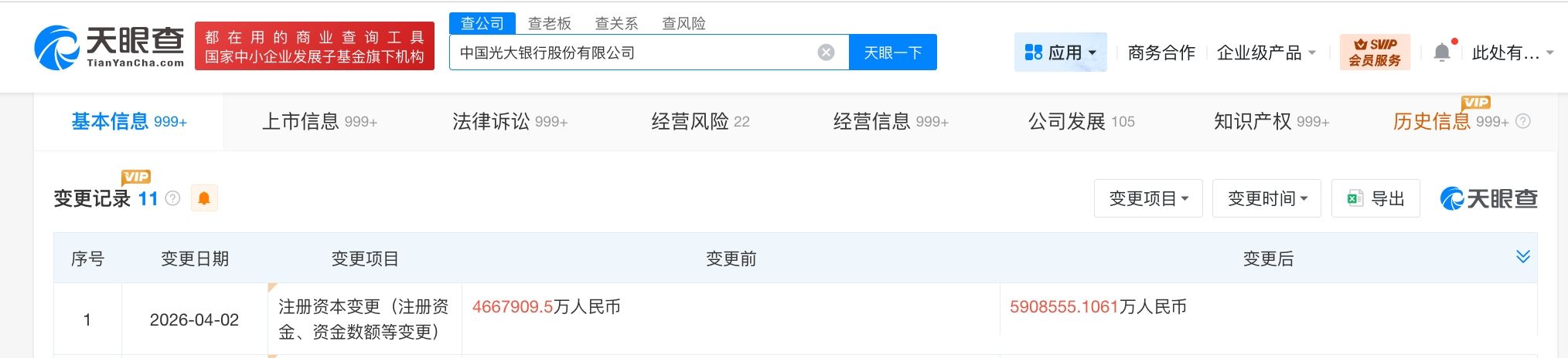 天眼查工商信息显示,近日,光大银行(601818)发生工商变更,注册资本由约466.8亿人民币增至约590.9亿人民币,增幅约27%。