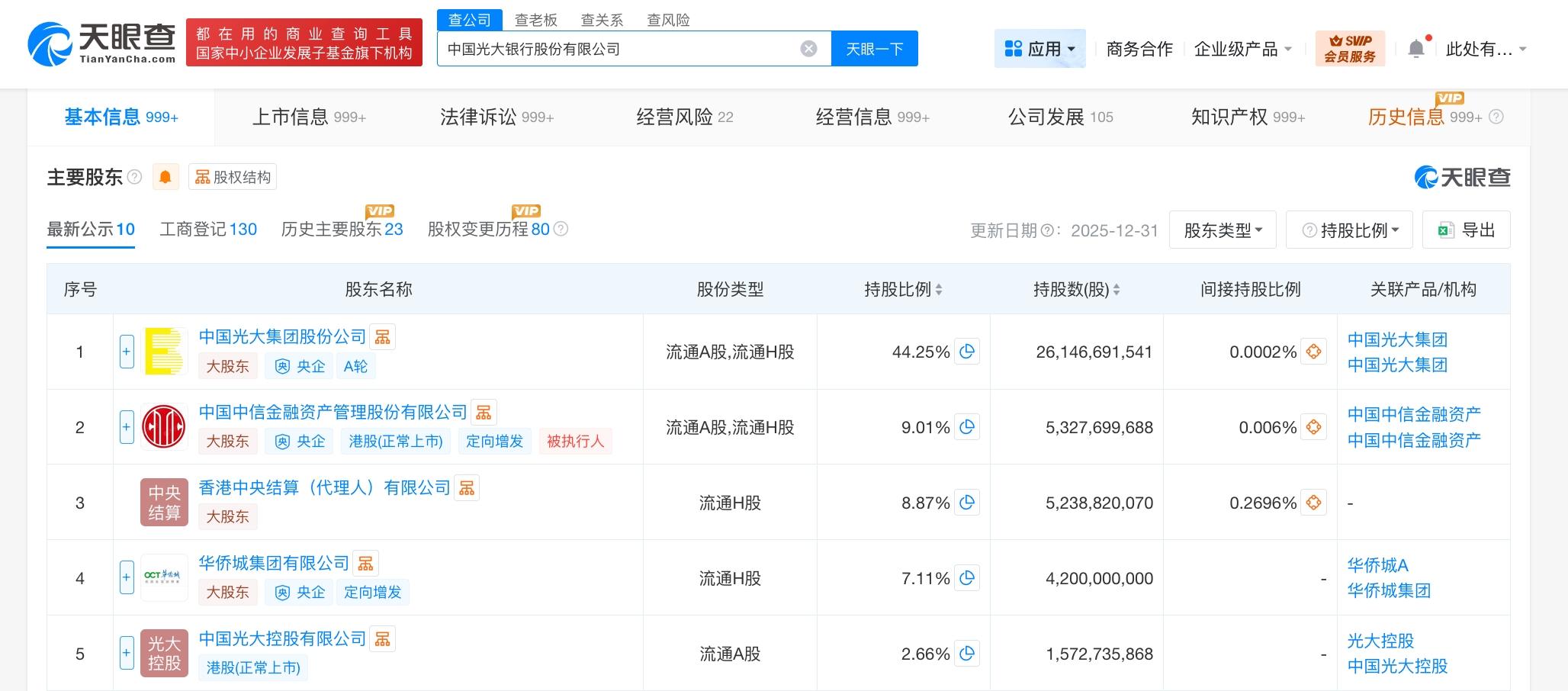 中国光大银行股份有限公司成立于1992年6月,法定代表人为吴利军,经营范围为银行业务。股东信息显示,该公司由中国光大集团股份公司、中信金融资产(02799.HK)等共同持股。