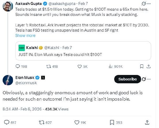 伍德说:“我认为最终市值会达到100万亿美元。我认为这将会发生,因为技术融合正在推动这一进程。我认为特斯拉是(市值达到100万亿美元的)领跑者。”
