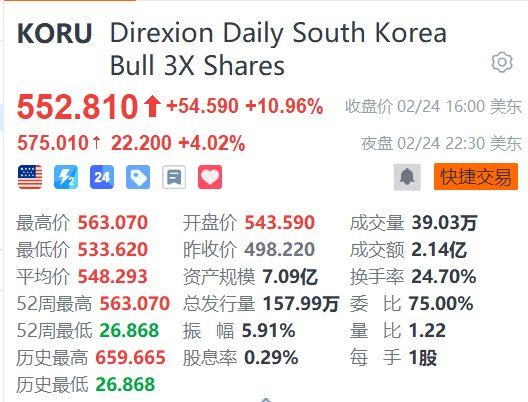韩国股市持续创出历史新高,刺激港股市场韩股概念股走强。其中:南方两倍做多海力士(7709.HK)盘中一度涨近7%,创新高;南方两倍做多三星电子(7747.HK)一度涨近5%,亦创新高。另外,美股市场中,Direxion Daily South Korea Bull 3X Shares(KORU.US)隔夜收涨近11%后,在目前的夜盘交易中再度涨超4%,报575.01美元。