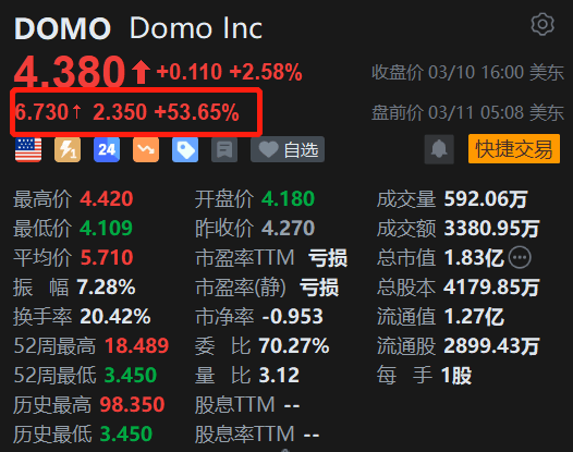 商业情报(BI)软件公司Domo Inc (DOMO.US)盘前飙涨53.65%报6.73美元。消息上,Domo Inc第四财季非美国通用会计准则每股摊薄收益为0.03美元,而上年同期则亏损0.05美元。截至1月31日的本季度收入为7960万,高于上年同期的7880万。该公司还在2026财年的前两个季度超过了每股收益预期。(格隆汇)
