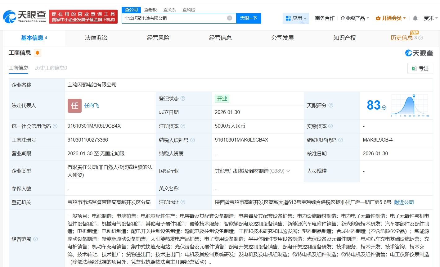 吉利汽车在宝鸡成立闪聚电池公司 注册资本5000万 lnradio.com 2026年02月02日 13:06 3 0 天眼查App显示,近日,宝鸡闪聚电池有限公司成立,法定代表人为任向飞,注册资本5000万人民币,经营范围包括电池制造、电池销售、电池零配件生产、电容器及其配套设备制造等。股东信息显示,该公司由浙江吉利汽车零部件产业有限公司全资持股。