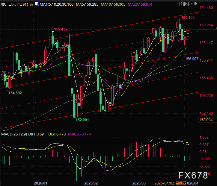 在耶稣受难日假期导致外汇市场交投清淡的背景下,周五亚洲交易时段日元对一篮子主要及次要货币全线走弱,美元兑日元连续第三个交易日处于下行区间,当日美元兑日元上行0.1%至159.72。