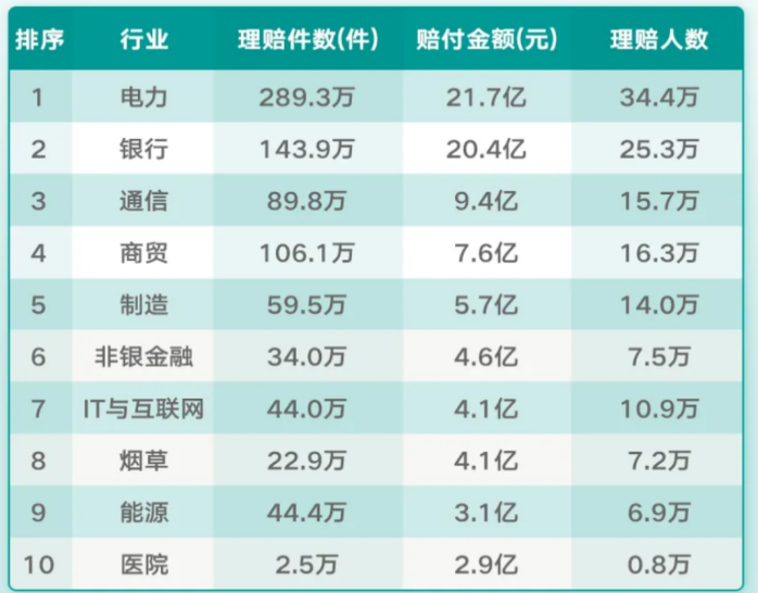 值得一提的是,作为养老险公司,泰康养老比较特殊,主要为企事业单位提供一揽子医养福利保障,自2013年创新推出职域服务模式以来,泰康养老将保障从企业延伸至职工及家庭,服务覆盖超1800万人。从泰康养老披露的理赔年报数据可以看出,电力、银行、通信行业的赔付金额居前,赔付金额分别达21.7亿元、20.4亿元和9.4亿元。