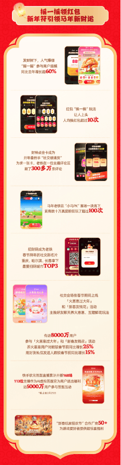 社交互动类活动同样亮点纷呈,近8000万用户参与“火崽崽过大年”“新春友钱花”活动,养火崽崽用户对数较春节前增长25%,好友私信发送人数同比提升15%,有效激活半熟人社交链。此外,“快手状元”答题直播累计开播168场,近5000万用户参与互动;“新春玩家狂欢节”集结50+合作厂商,为游戏爱好者带来丰厚福利。