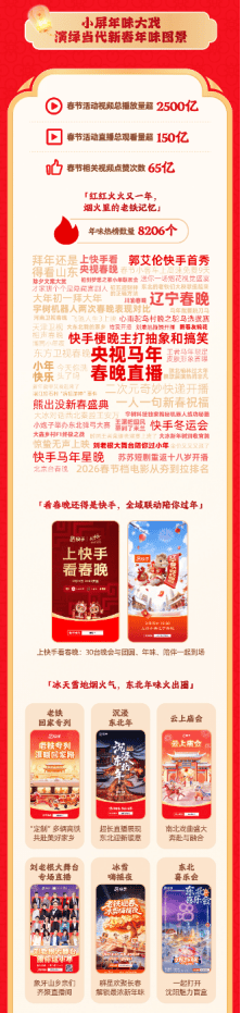 今年春节活动期间,快手以“小屏大戏”构建全民共享的数字年俗图景,激发了老铁们在快手过春节的热情。数据显示,今年春节活动视频总播放量超2500亿,直播总观看量超150亿,相关视频点赞次数 65亿,热点话题词覆盖春晚、年俗、运动等多个领域,全面展示了快手用户过年期间的生活全貌,传递最真实的新春气息。