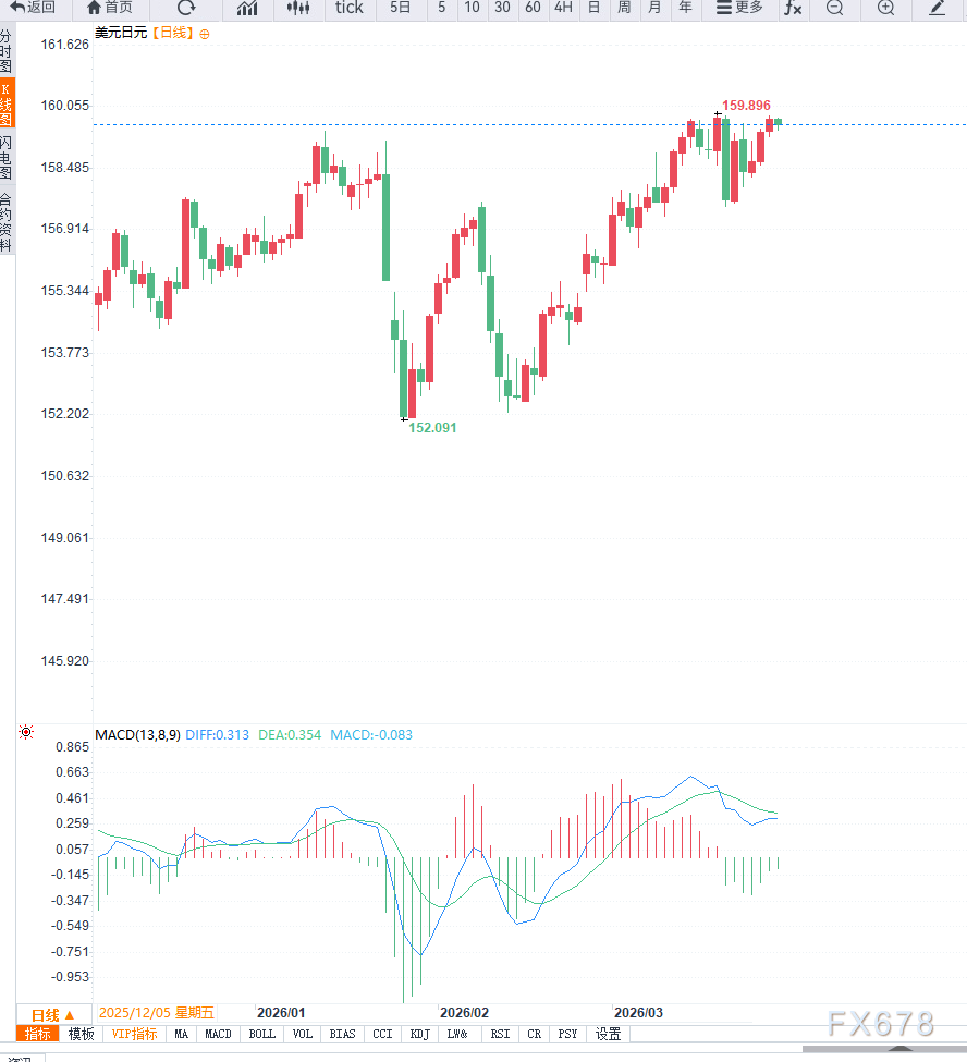 从技术面来看,美元兑日元日线图形维持明显上升趋势。自2月低点152.30附近以来,汇价持续抬高低点与高点,形成典型多头结构。当前价格运行于主要均线之上,均线系统呈多头排列,显示趋势动能依旧强劲。MACD位于零轴上方,动能柱虽有所收敛但仍维持正值,表明上涨趋势尚未破坏;RSI处于高位区域但未明显超买,意味着仍有上行空间。上方关键阻力位集中在160.00关口,一旦有效突破,或打开进一步上行空间;下方支撑位位于158.50及157.50区域。