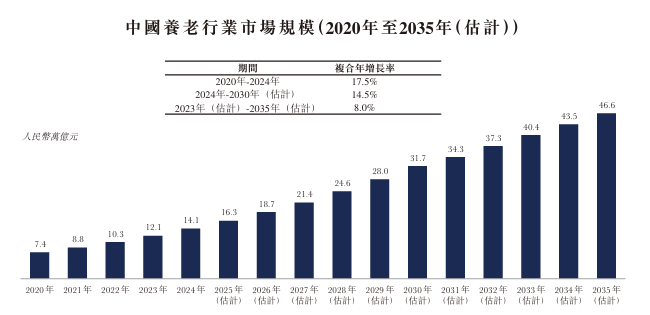 中国养老行业市场规模正迎来高速增长期:2020年市场规模仅7.4万亿元,2024年已增至14.1万亿元,2020-2024 年复合年增长率达17.5%;预计到2030年将突破31.7万亿元,2035年更是有望攀升至46.6 万亿元,2023-2035 年复合年增长率仍保持8%的稳健水平。