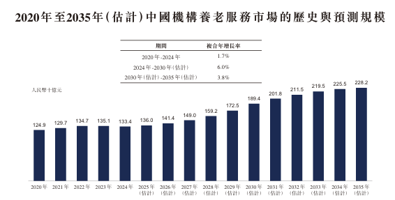 其中机构养老服务市场同样持续扩容,2020年规模为1249亿元,2024年达1334亿元,预计2035年将增长至2282亿元,2024-2030年复合年增长率为6%。