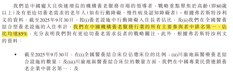根据弗若斯特沙利文数据,按医养结合型养老设施入住率计,锦欣在全国排名第一;在川渝地区,其医养结合设施数量和床位数量均排名第一。