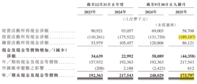 截至2025年9月30日,公司现金及现金等价物为1.74亿元。而同期投资净流出高达1.89亿元,已是经营现金流的3.2倍。经营造血能力下滑、投资支出扩大,外部融资支持力度却在减弱,这正是公司亟需上市募资输血的深层原因。
