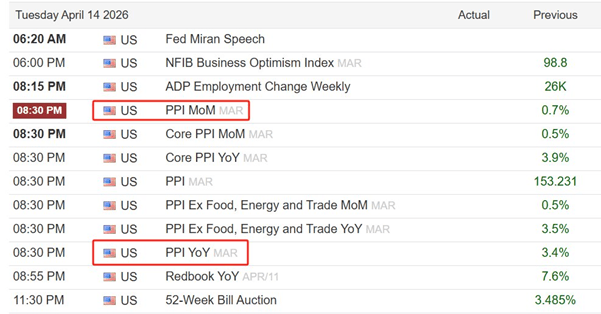 三月份PPI年率的预期值是4.6%,远远高于前值3.4%,意味着三月份美国的生产端物价出现了剧烈波动。三月份PPI月率的预期值是1.2%,高于前值0.7%,同样意味着生产端价格升高。驱动价格上涨的因素有目共睹,美国和伊朗之间的战争导致国际油价从六十美元以下上涨至一百美元以上,能源价格成为推高美国以及其他国家通胀率的核心因素。上周美国公布的CPI数据也印证了这一观点。