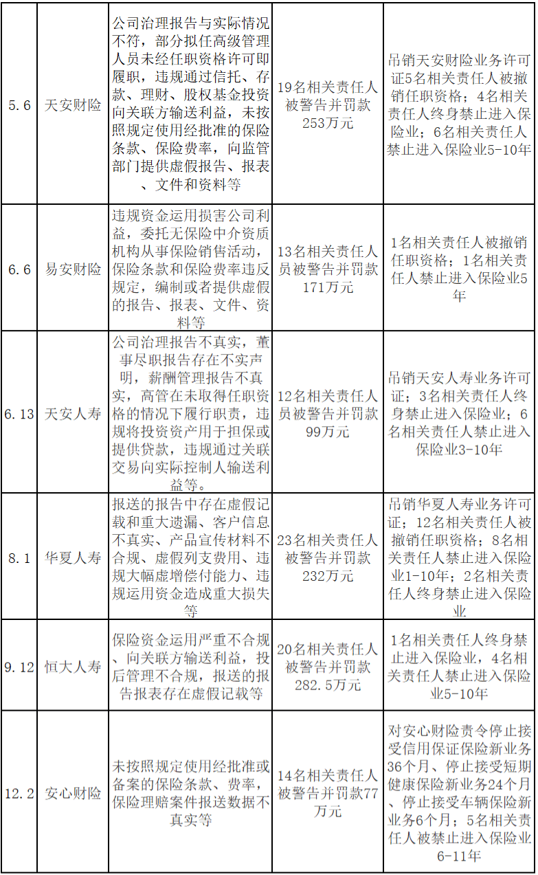 天安财险,16人被罚款253万元,5人撤销任职资格,4人终身禁业,4人10年禁业,2人5年禁业;