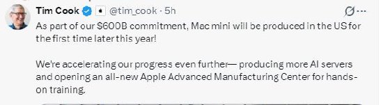 苹果CEO蒂姆·库克在社交平台X上发帖称:“作为我们6000亿美元投资计划的一部分,Mac mini将于今年晚些时候首次在美国进行生产!我们正在进一步加快步伐——生产更多的AI服务器,并开设一家全新的苹果先进制造中心,用于提供实践培训。”