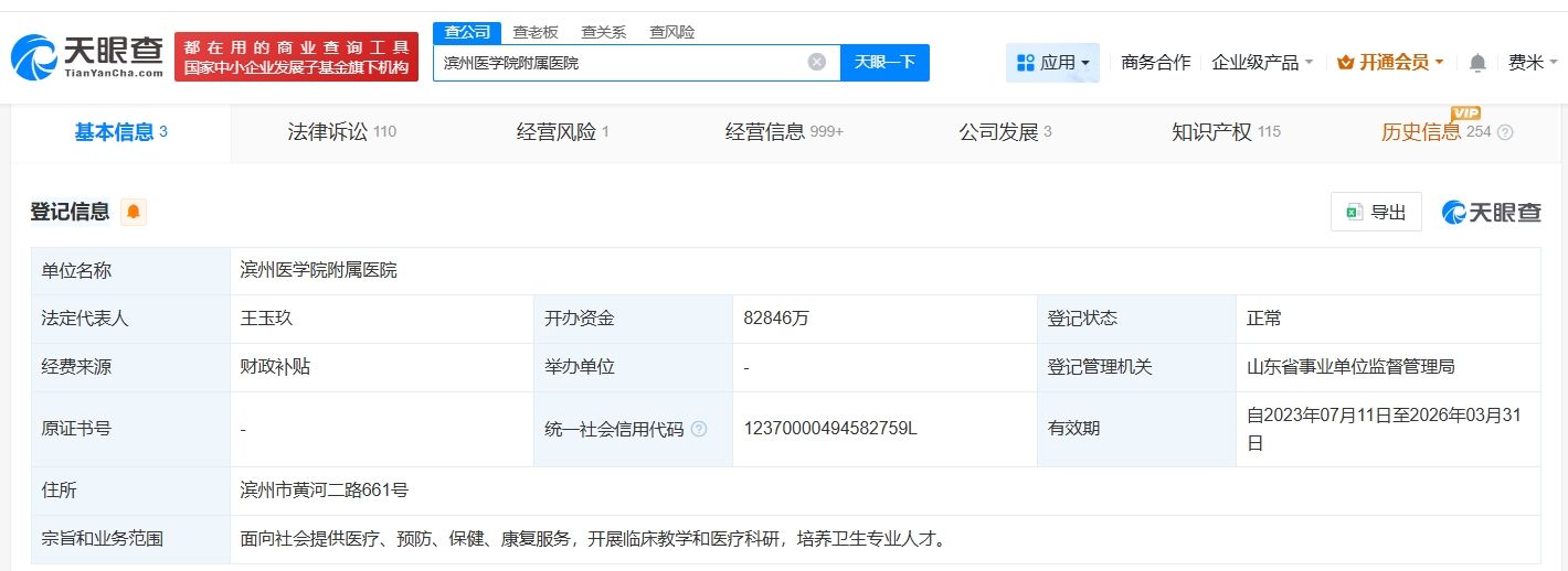 天眼查App显示,涉事医院滨州医学院附属医院法定代表人为王玉玖,开办资金约8.3亿人民币,宗旨和业务范围为面向社会提供医疗、预防、保健、康复服务,开展临床教学和医疗科研,培养卫生专业人才,法律诉讼信息显示,该医院曾因医疗损害责任纠纷、医疗损害赔偿纠纷、医疗服务合同纠纷等被起诉。历史信息显示,该医院曾存在被执行人、失信被执行人(老赖)信息。