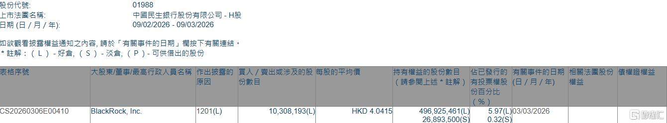 格隆汇3月9日丨根据联交所最新权益披露资料显示,2026年3月3日,民生银行(01988.HK)遭BlackRock, Inc.在场内以每股均价4.0415港元减持好仓1030.82万股,涉资约4166.1万港元。