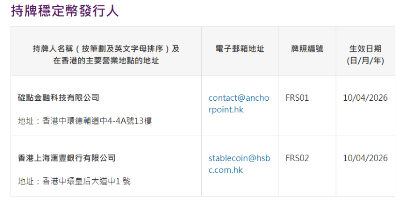 4月10日,香港金融管理局(简称:“香港金管局”)宣布向碇点金融科技、香港上海汇丰银行授予稳定币发行人牌照,即首批稳定币发行人仅2家,颇有“试点”的意味。其中,碇点金融科技是由渣打银行(香港)、香港电讯和安拟集团共同设立。
