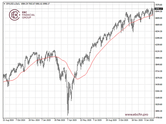 标普500指数整体维持在50日均线上方运行,因此任何跌破该支撑位的回调都可能成为逢低买入的机会。若后续财报表现良好,指数有望突破7000点关口。