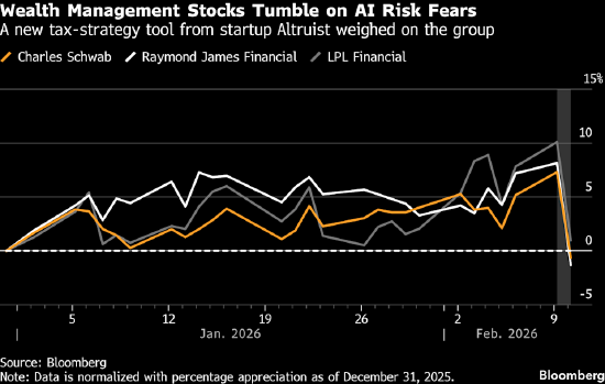 在华尔街,人们对人工智能的担忧日益加剧,不断冲击着那些可能处于不利地位的公司股票——从小型软件厂商到大型财富管理公司无一幸免。