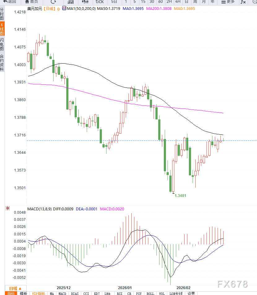 市场对中东局势的敏感度仍然较高,任何紧张升级迹象都可能推高原油价格。由于加拿大是重要能源出口国,油价走强通常会增强加元表现,从而对USD/CAD形成压制。