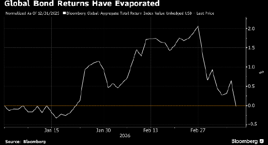 追踪投资级政府和公司债券总回报的彭博全球综合指数2026年迄今基本持平。随着油价重回每桶100美元上方,全球债券周四进一步遭到抛售。该指数今年截至2月27日曾累计上涨2.1%,但之后美国总统特朗普对伊朗发动了攻击,凸显地缘政治冲击下情绪转变之快。