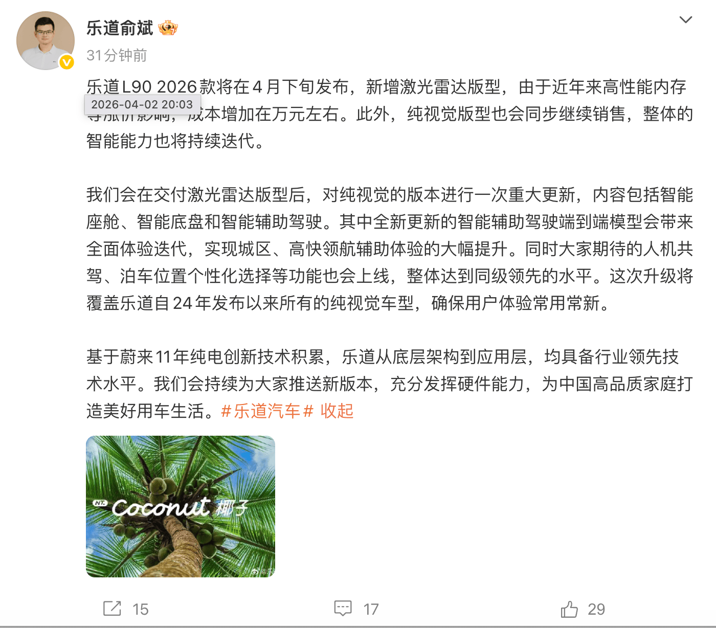 凤凰网科技讯 4月2日,蔚来助理副总裁、乐道汽车产品负责人俞斌宣布,乐道L90 2026款将在4月下旬发布,新增激光雷达版型。俞斌提到,由于近年来高性能内存等涨价影响,成本增加在万元左右。此外,纯视觉版型也会同步继续销售,整体的智能能力也将持续迭代。