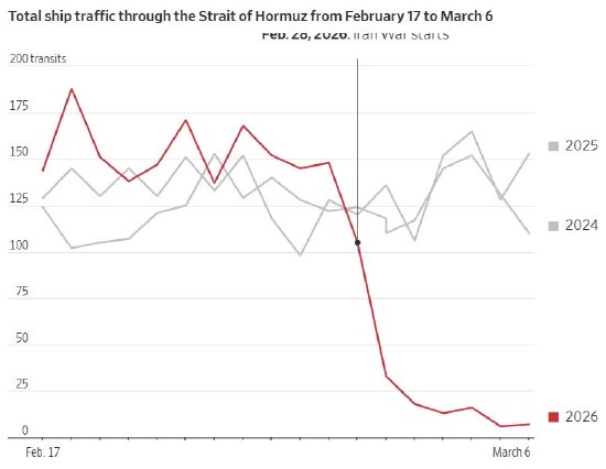 自战争爆发以来,航运几乎陷入停滞,伊朗对商业船只的攻击迫使船东暂停航行。少数通过海峡的船只主要运输伊朗石油。印度正与伊朗进行谈判,争取让至少23艘滞留在波斯湾的油轮和液化天然气船恢复通行。