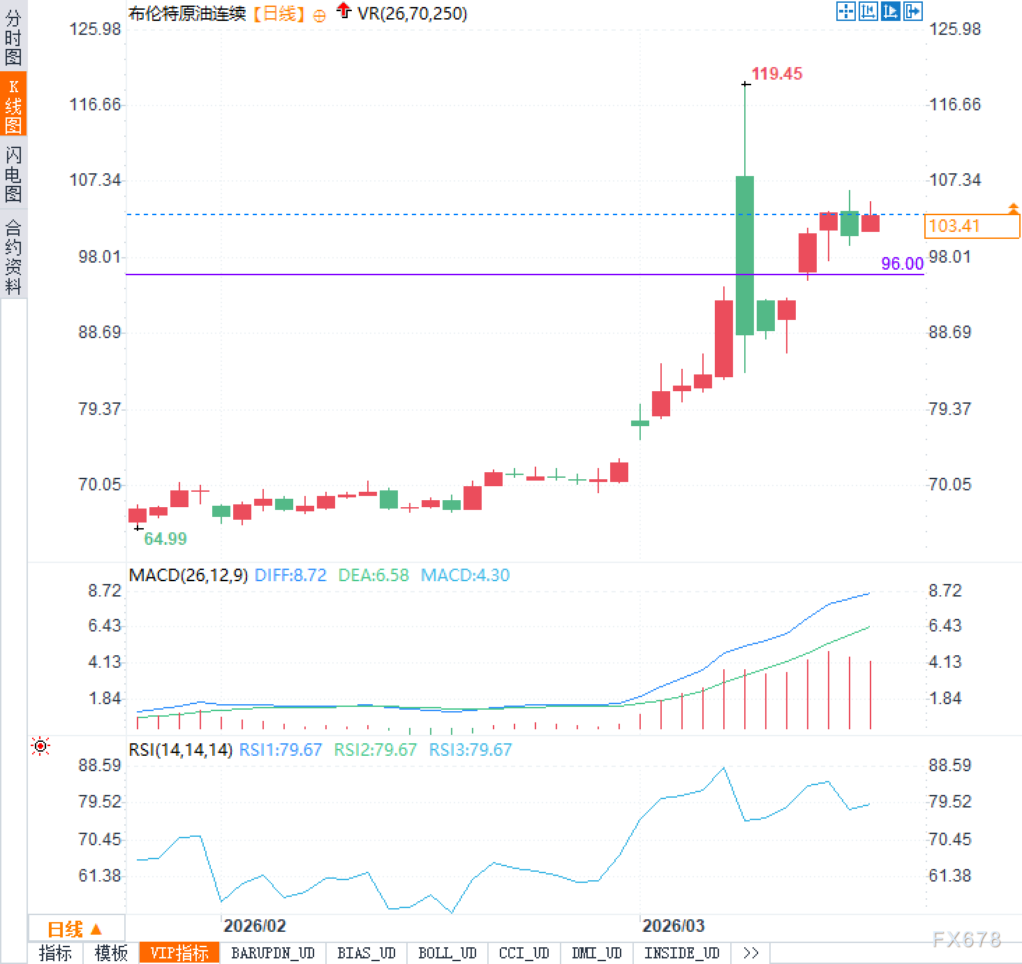 该表态直接压缩了市场对短期缓和的概率定价,资金随即把焦点重新锚定在航运咽喉与能源设施的尾部风险上,原油在前一日波动后继续维持高位运行。布伦特原油当前交投103.50美元每桶附近,WTI原油约97美元每桶,反映风险溢价仍在价格中占据主导地位。