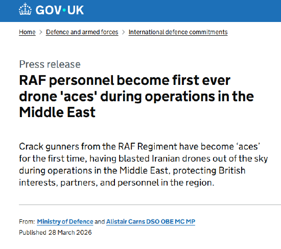 英国国防部表示,英国皇家空军兵团的精锐炮手首次荣获“王牌”称号。他们在中东行动中击落伊朗无人机,保护了英国在该地区的利益、伙伴及人员安全。