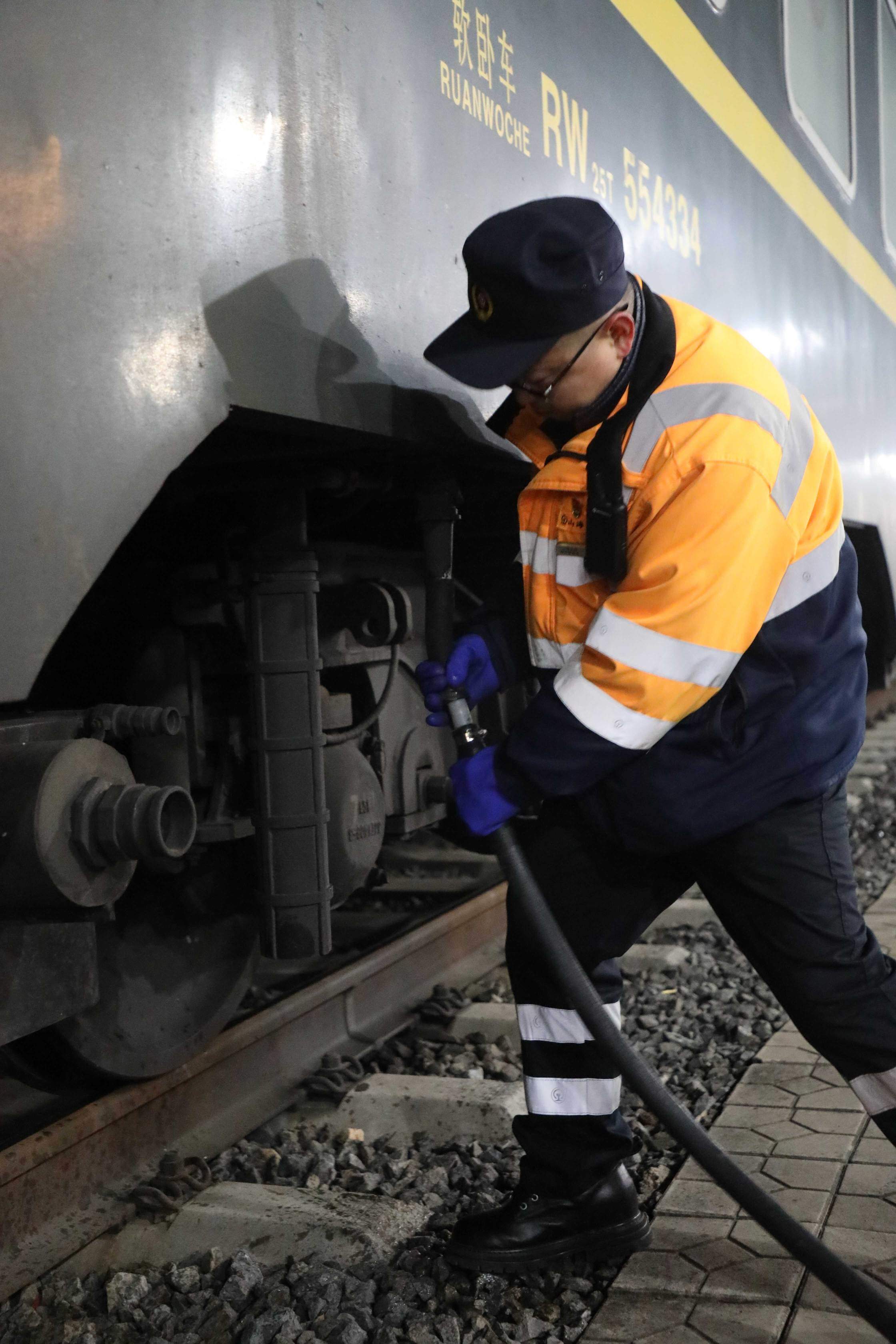 客车给水工作看似简单,实则是苦、脏、累兼具的体力活,“晴天一身灰,雨雪两脚泥”是给水员们的真实写照。今年42岁的刘超,主动从客运员岗位转岗至给水一线,一干就将近10年。春运期间列车站停仅5至6分钟,扣除往返、插拔管的时间,有效注水时间不足4分钟,必须做到又快又稳、零失误。寒冬夜里,一旦水管漏水喷溅,水渍沾到衣服上便会瞬间冻成“冰壳”,贴在身上冰冷刺骨。可为了保证作业灵活,给水员们不能戴耳套、不能穿厚重大衣,只能在棉手套外再套一层橡胶手套,既防冻又增加了操作难度。“穿单薄点跑得快,干起活来出了汗反倒暖和。”刘超笑着说道。
