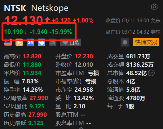 网络安全公司Netskope盘前大幅下跌16%。消息上,Netskope26财年第四财季调整后每股亏损为0.04,较一年前的每股亏损0.23有所收窄。2027财年指引较为保守(营收8.7-8.76亿美元,增速放缓至23%)。此外,公司IPO后的180天禁售期将于3月13日(本周五)到期,大量内部人士和早期投资者的股票将可以上市交易。