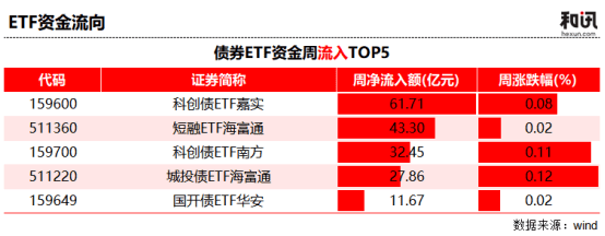 数据显示,债券ETF资金周流入TOP5合计净流入超过156亿元,其中科创债主题产品表现尤为突出。科创债ETF嘉实 以61.71亿元的周净流入额居首,科创债ETF南方也录得32.45亿元的净流入。此外,短融ETF海富通、城投债ETF海富通及国开债ETF华安均获得超10亿元的资金增持。