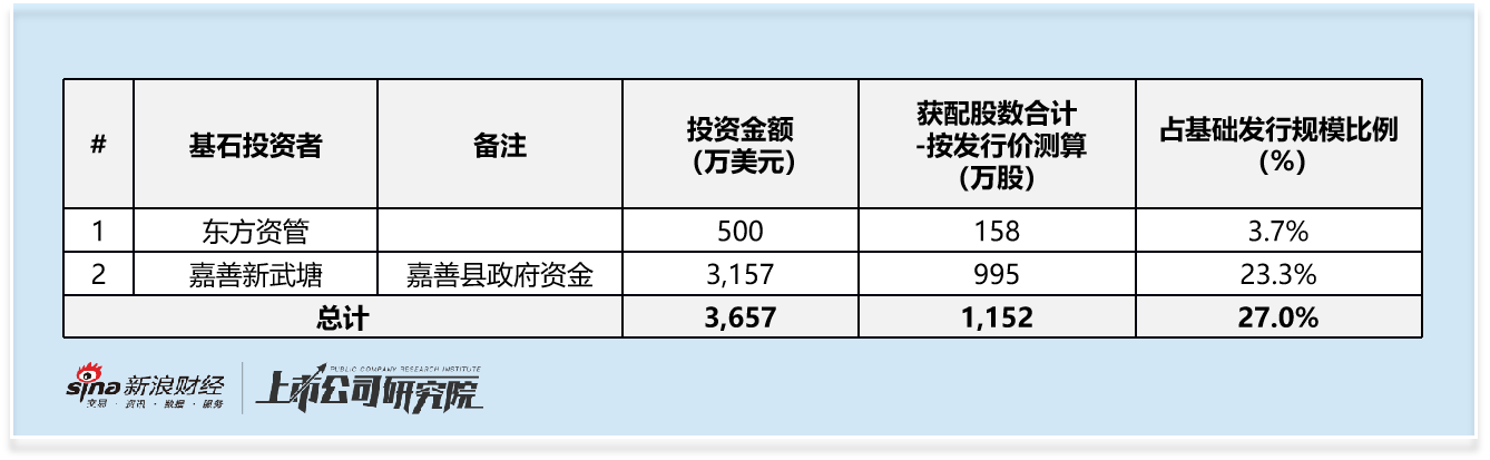 最直观的是基石投资者阵容薄弱。仅有两家机构参与,合计认购3657万美元,占基础发行规模的27.0%,低于近期港股市场普遍超过40%的基石认购比例。其中,唯一的财务投资者东方资管仅出资500万美元,在港股市场影响力有限;另一家基石嘉善新武塘(出资3157万美元)为嘉善县地方政府背景。根据招股书,公司计划于当地建设集研发与制造于一体的生产基地,因此其投资属于资源置换,而非纯粹的市场化认可。