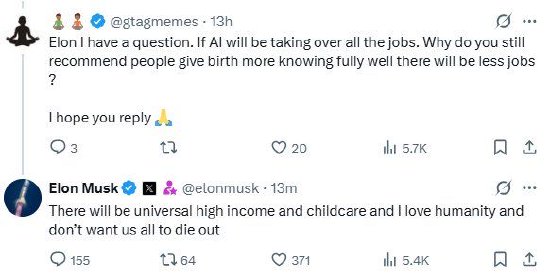 马斯克:“不希望人类灭绝” lnradio.com 2026年01月29日 22:45 25 0 有网友问,“埃隆,我有个问题。既然人工智能终将接管所有工作,你明明清楚未来就业岗位会减少,为什么还建议大家多生孩子呢?” 马斯克对此回应称:“将会有全民高收入和育儿福利,而且我热爱人类,不希望我们走向灭绝。”