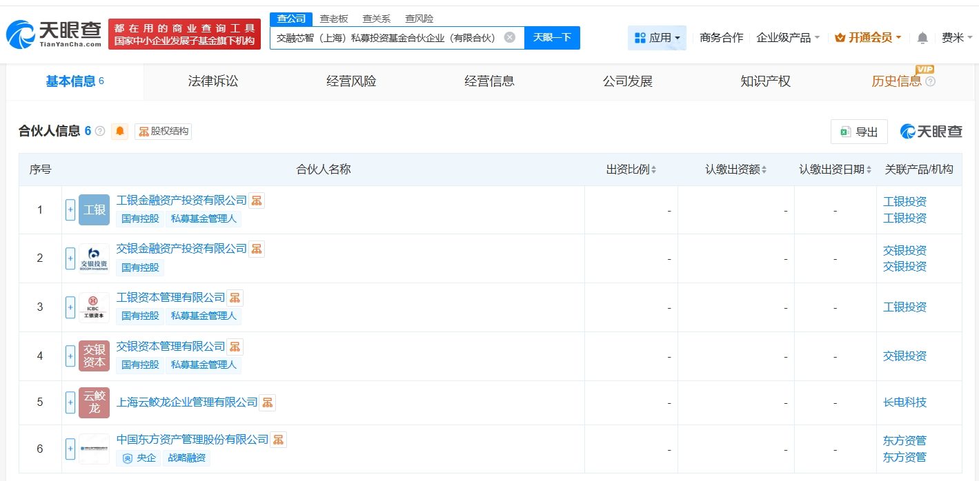 天眼查App显示,2月28日,交融芯智(上海)私募投资基金合伙企业(有限合伙)成立,执行事务合伙人为交银资本管理有限公司、工银资本管理有限公司,出资额13.46亿人民币,经营范围为以私募基金从事股权投资、投资管理、资产管理等活动,创业投资,由工银金融资产投资有限公司、交银金融资产投资有限公司、长电科技(600584)旗下上海云鲛龙企业管理有限公司等共同出资。
