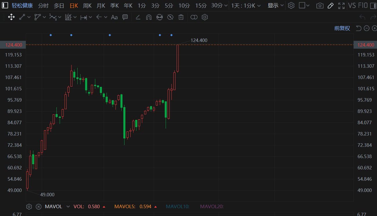 轻松健康(2661.HK)再度拉升涨超13%,报124.4港元刷新上市以来新高价,并且录得4连升累计涨幅超过40%,总市值达256.7亿港元。