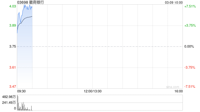 徽商银行(03698)发盈喜后高开逾4%,截至发稿,股价上涨4.53%,报3.92港元,成交额6716.83万港元。