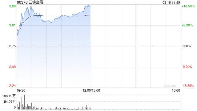 云锋金融(00376)今早曾涨近18%,上一交易日一度涨超10%,最终收涨逾3%。截至发稿,涨15.27%,报3.17港元,成交额1.06亿港元。