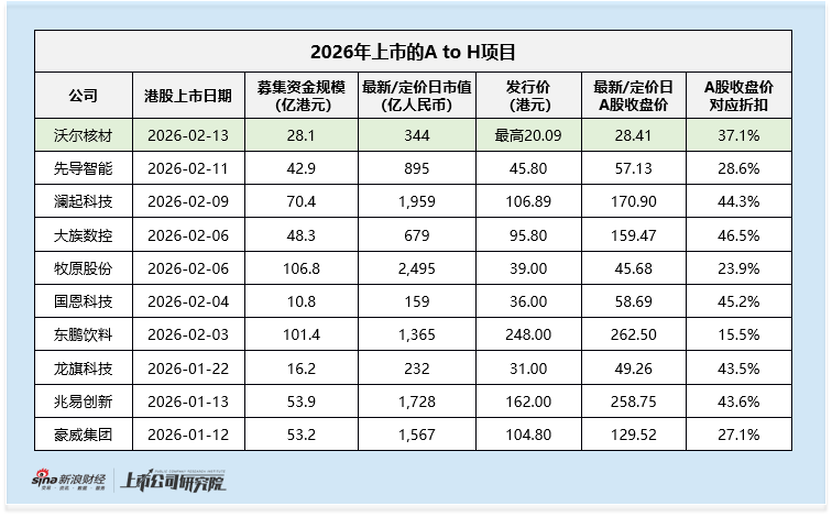 沃尔核材本次港股最高发行价20.09港元/股,较A股2月10日收盘价28.41元/股折价约37.1%。参考2026年至今的10单A to H项目,该折扣水平吸引力有限,仅东鹏饮料、豪威集团、牧原股份、先导智能4单项目的折扣水平小于沃尔核材,此外还有6单项目的折扣水平均达到40%以上,其中不乏千亿市值级别的公司。