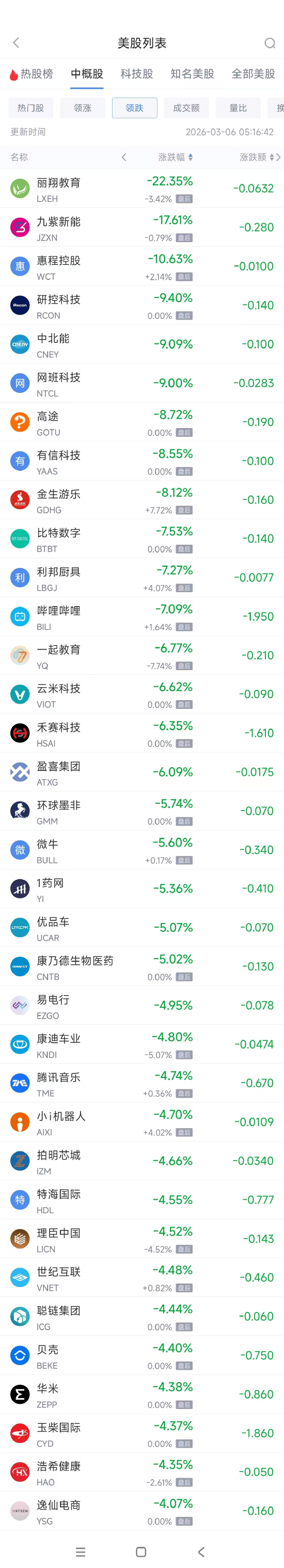 领跌中概股列表: