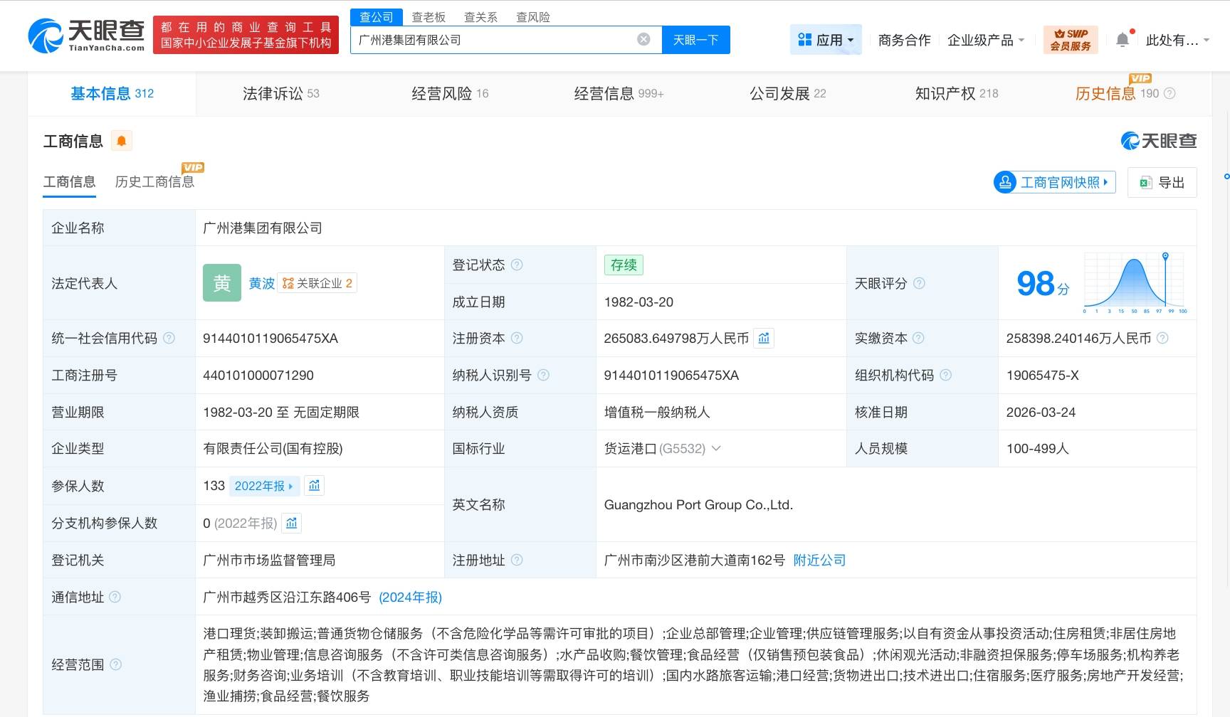 该公司成立于1982年3月,法定代表人为黄波,经营范围包括港口理货、装卸搬运、普通货物仓储服务、企业总部管理、供应链管理服务、港口经营、货物进出口等。股东信息显示,该公司由广州市人民政府、广东省财政厅共同持股。