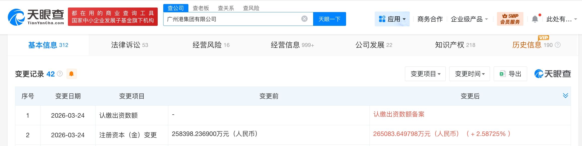 天眼查工商信息显示,近日,广州港集团有限公司发生工商变更,注册资本由约25.8亿人民币增至约26.5亿人民币。
