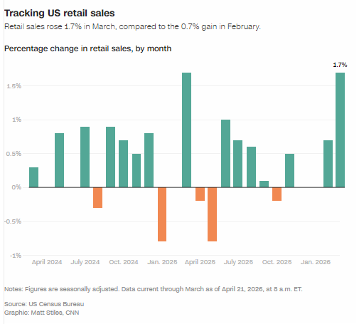 美国商务部周二公布的数据显示,受战争引发的油价飙升推动,3 月美国零售销售额环比增长 1.7%,创下三年多来最快月度增速。