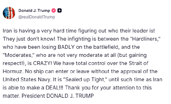 特朗普在社交媒体发文称:伊朗如今完全搞不清自己的领导层究竟是谁!他们一片混乱、毫无头绪!伊朗强硬派与温和派内斗愈演愈烈,局势极其失控:强硬派在战场上节节惨败、损失惨重;而所谓温和派实则一点也不温和,反倒日渐获得各方认可。我方已完全掌控霍尔木兹海峡。任何船只进出该海峡,都必须获得美国海军许可。在伊朗同意达成协议之前,霍尔木兹海峡将全面封锁、严防死守!