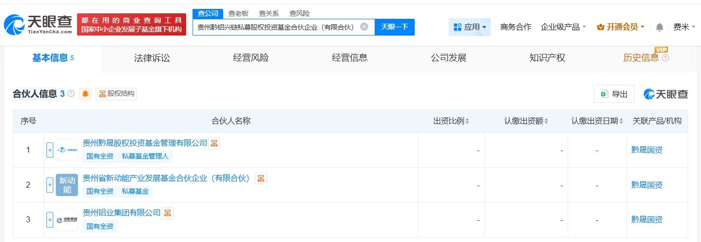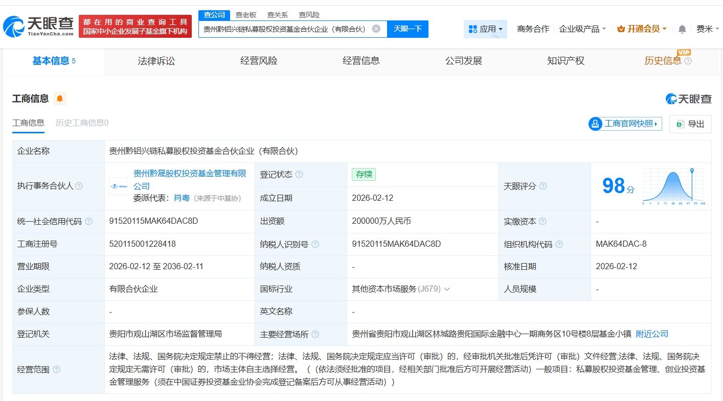 天眼查App显示,近日,贵州黔铝兴链私募股权投资基金合伙企业(有限合伙)成立,执行事务合伙人为贵州黔晟股权投资基金管理有限公司,出资额20亿人民币,经营范围为私募股权投资基金管理、创业投资基金管理服务,由贵州黔晟股权投资基金管理有限公司、贵州省新动能产业发展基金合伙企业(有限合伙)、贵州铝业集团有限公司共同出资。