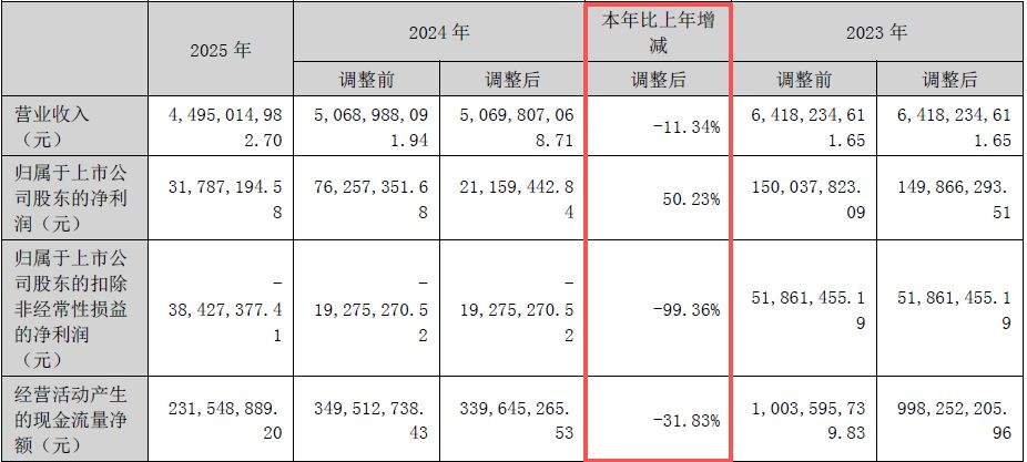 泸天化(SZ000912,股价6.02元,市值94.39亿元)3月15日晚间发布2025年年报,公司2025年实现营业收入约44.95亿元,同比下降11.34%;实现归母净利润约3178.72万元,同比增长50.23%;扣非归母净利润亏损约3842.74万元,亏损额同比扩大99.36%;基本每股收益0.02元,同比增长100%。